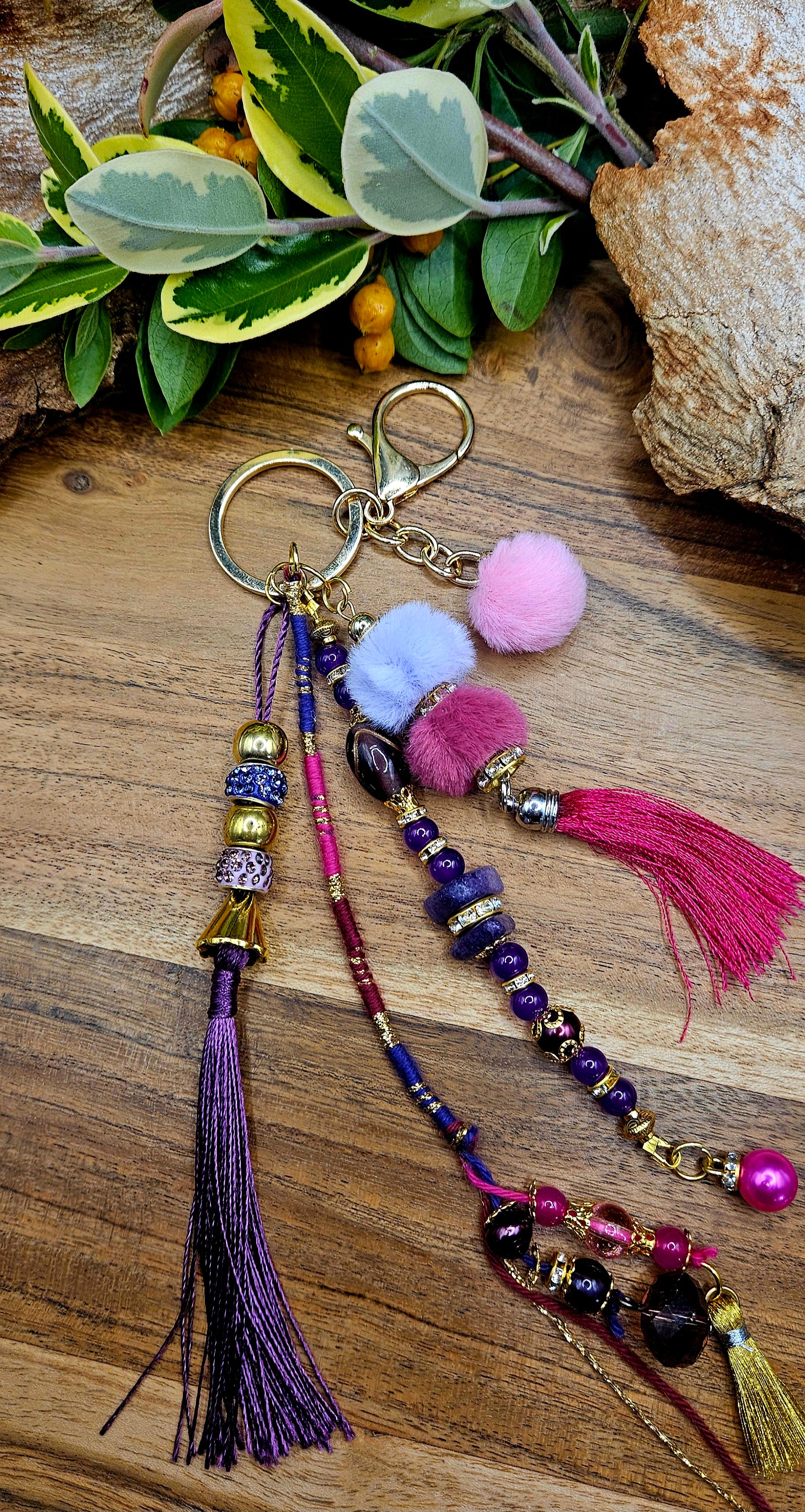 Brighten up your everyday with this handmade keyring in dreamy shades of pink and purple. Adorned with sparkling beads, soft feathers, and playful threads, each piece is carefully crafted to be a one-of-a-kind accessory. Perfect for your keys, bag, or as a delightful gift that spreads a little joy wherever it goes.