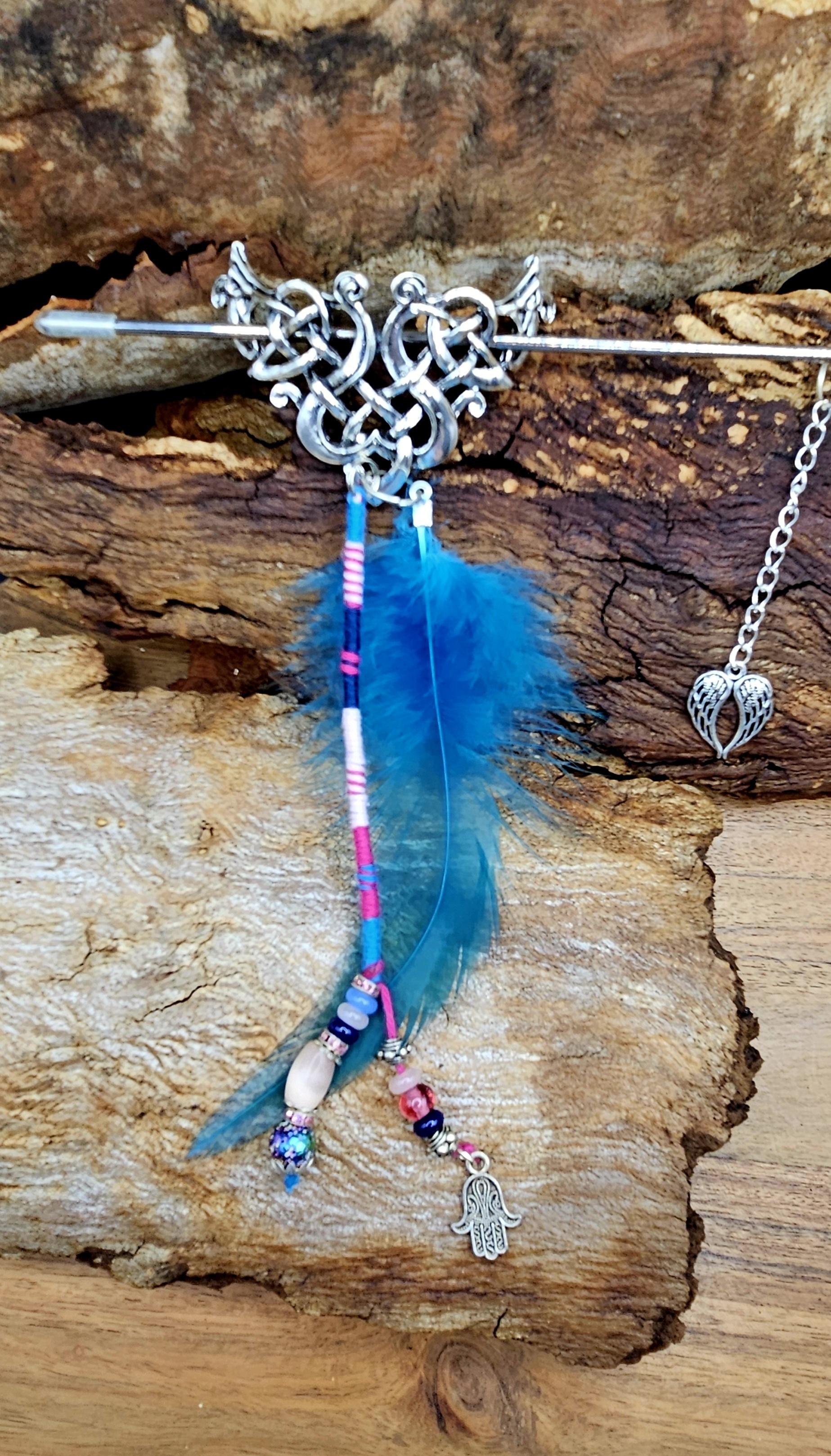 A stylish metal hairpin featuring a vibrant hair wrap and soft feather accents for a bold, boho-inspired look. Lightweight yet secure, it’s perfect for adding colour, texture, and movement to buns, twists, or half-up styles.