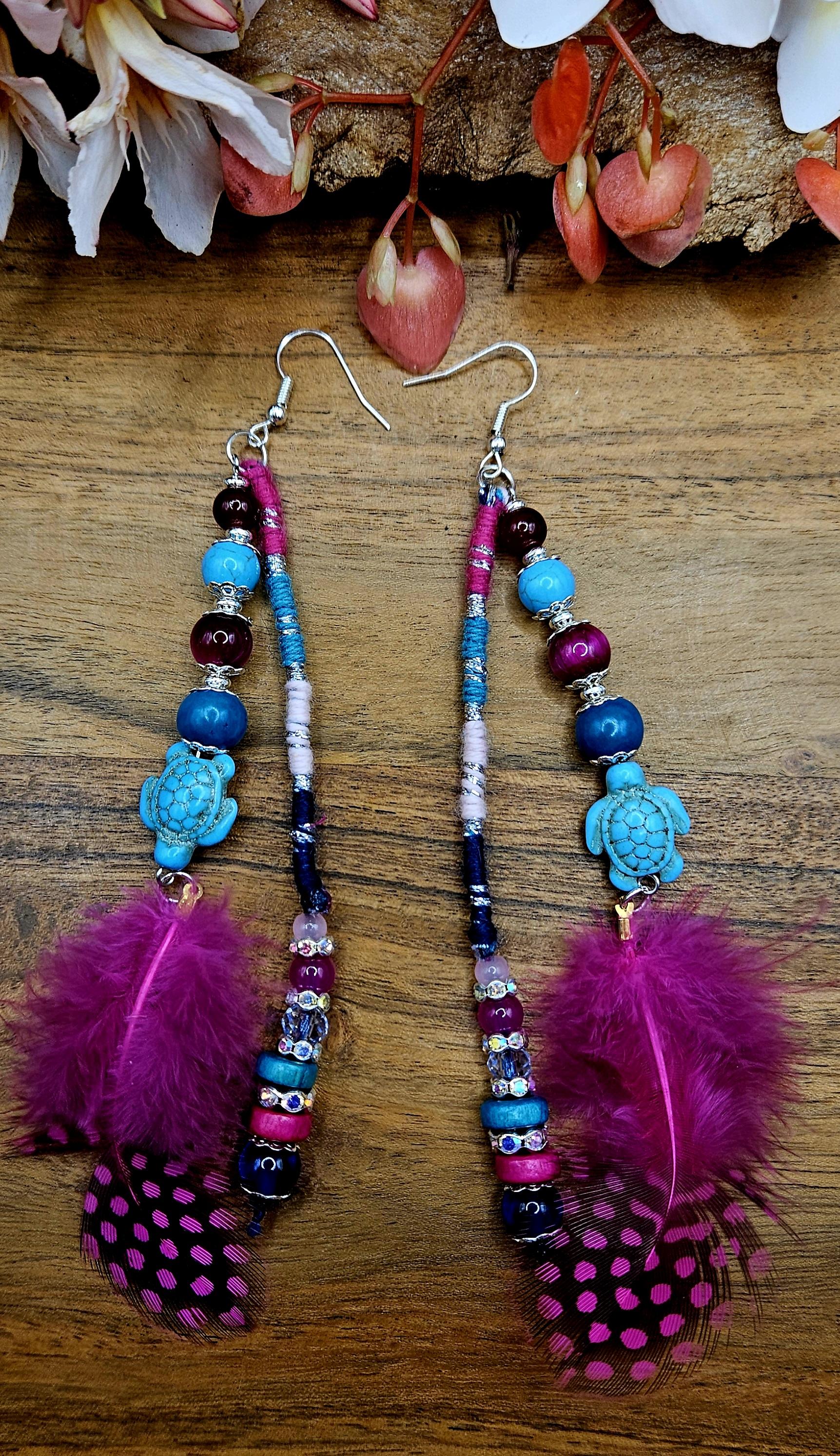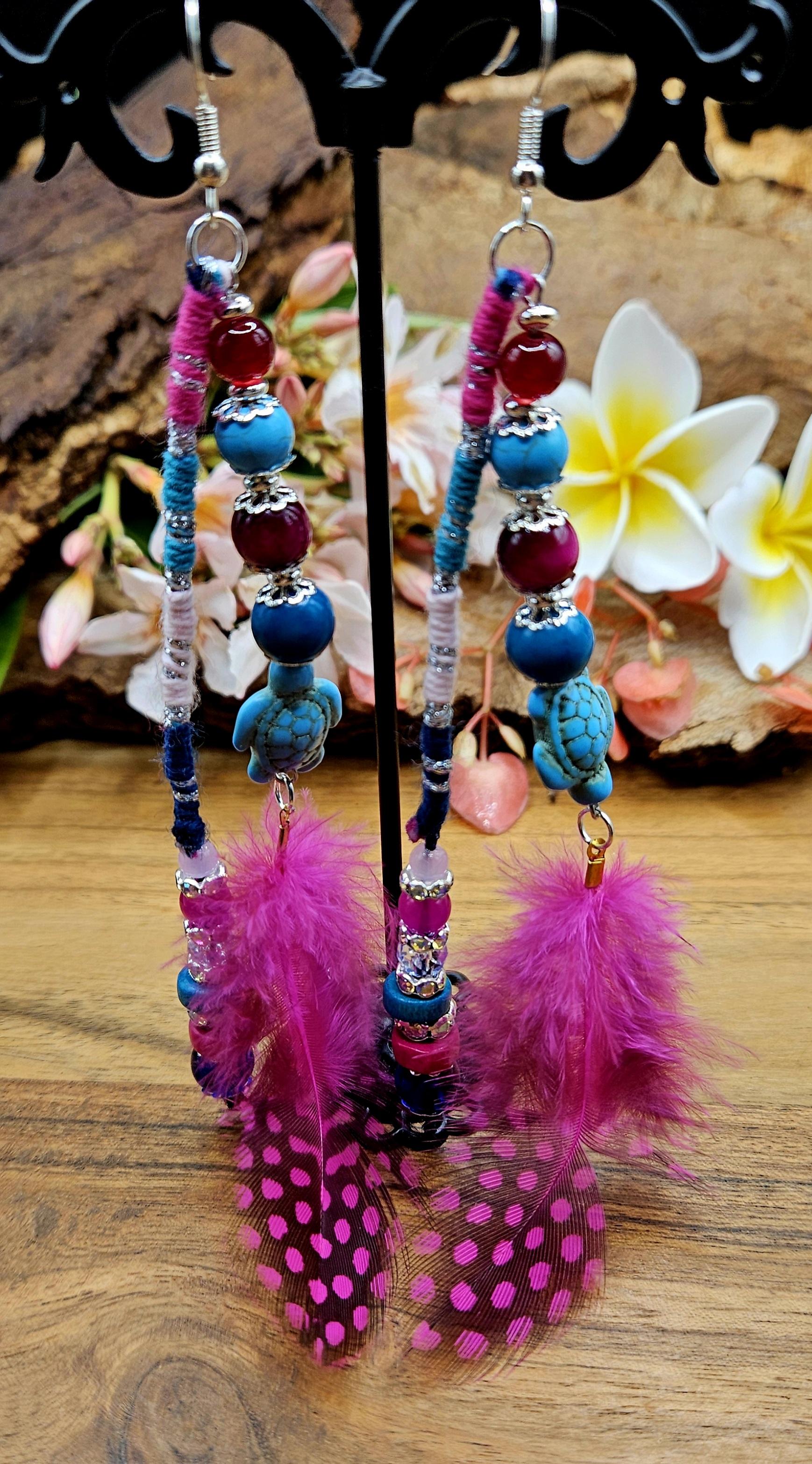 A vibrant hairwrap earring in turquoise and pink, finished with a soft feather that sways like sea breeze. Light, playful, and full of coastal energy.